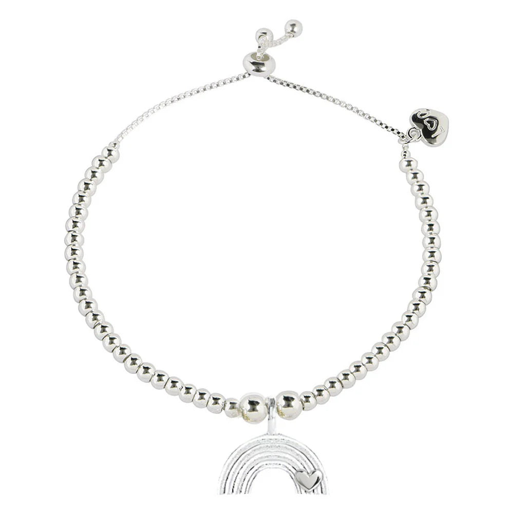 Bellissimo ciondolo che raffigura un arcobaleno con cuore placcato in argento su un braccialetto con perline regolabile.