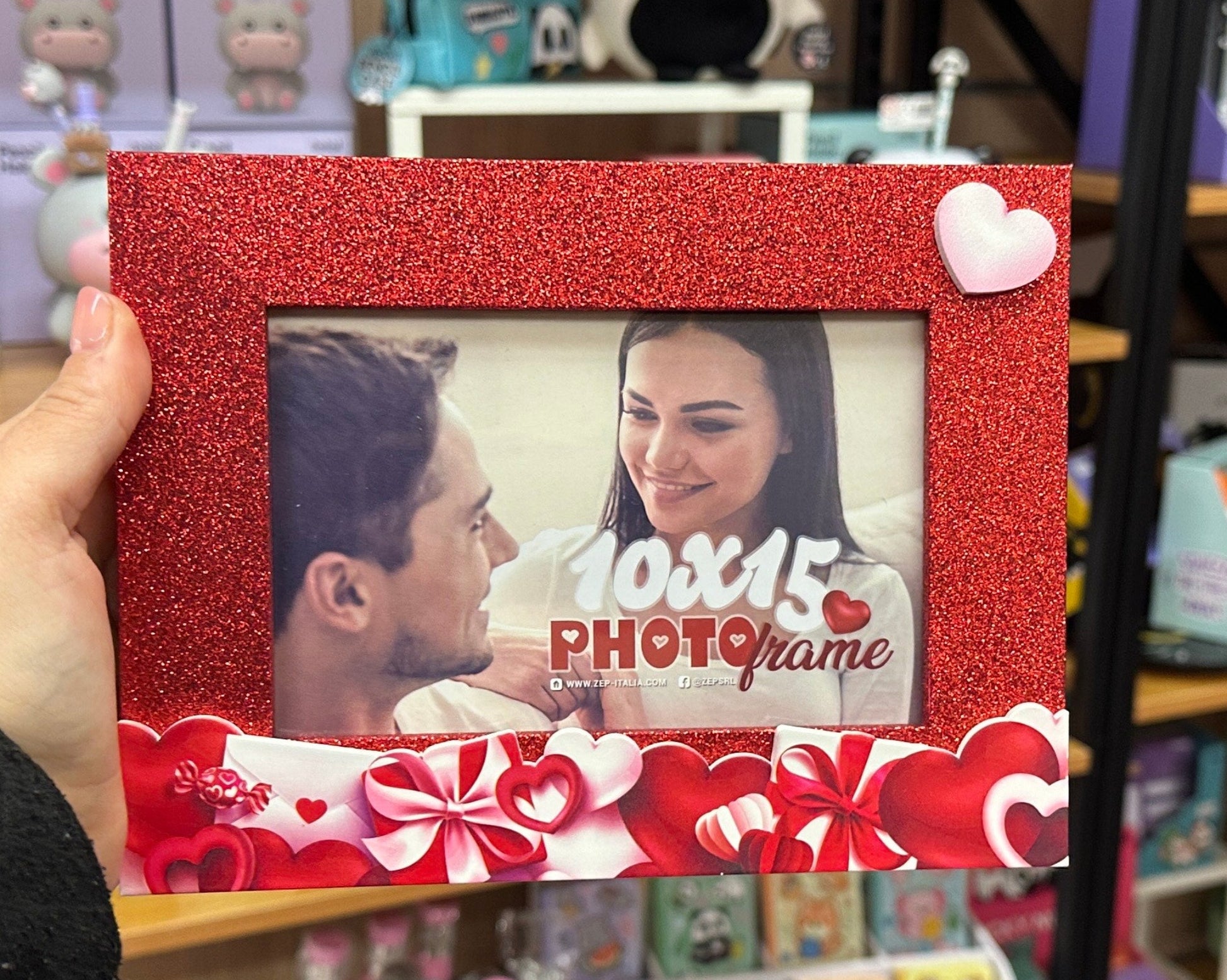 Rendi eterno ogni momento speciale con questa cornice portafoto romantica 10×15, perfetta per celebrare l’amore in tutte le sue forme. Il design elegante in rosso glitterato, impreziosito da cuori e fiocchi decorativi, trasforma una semplice foto in un ricordo prezioso da esporre con orgoglio.