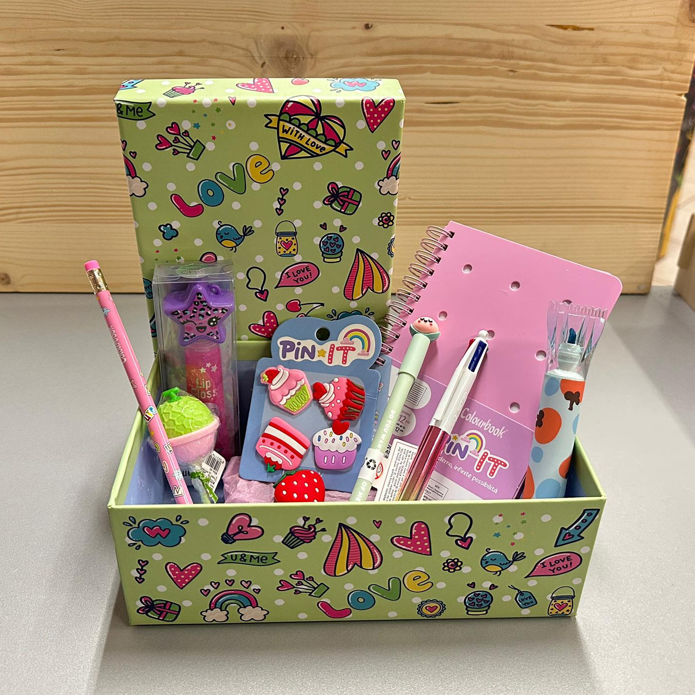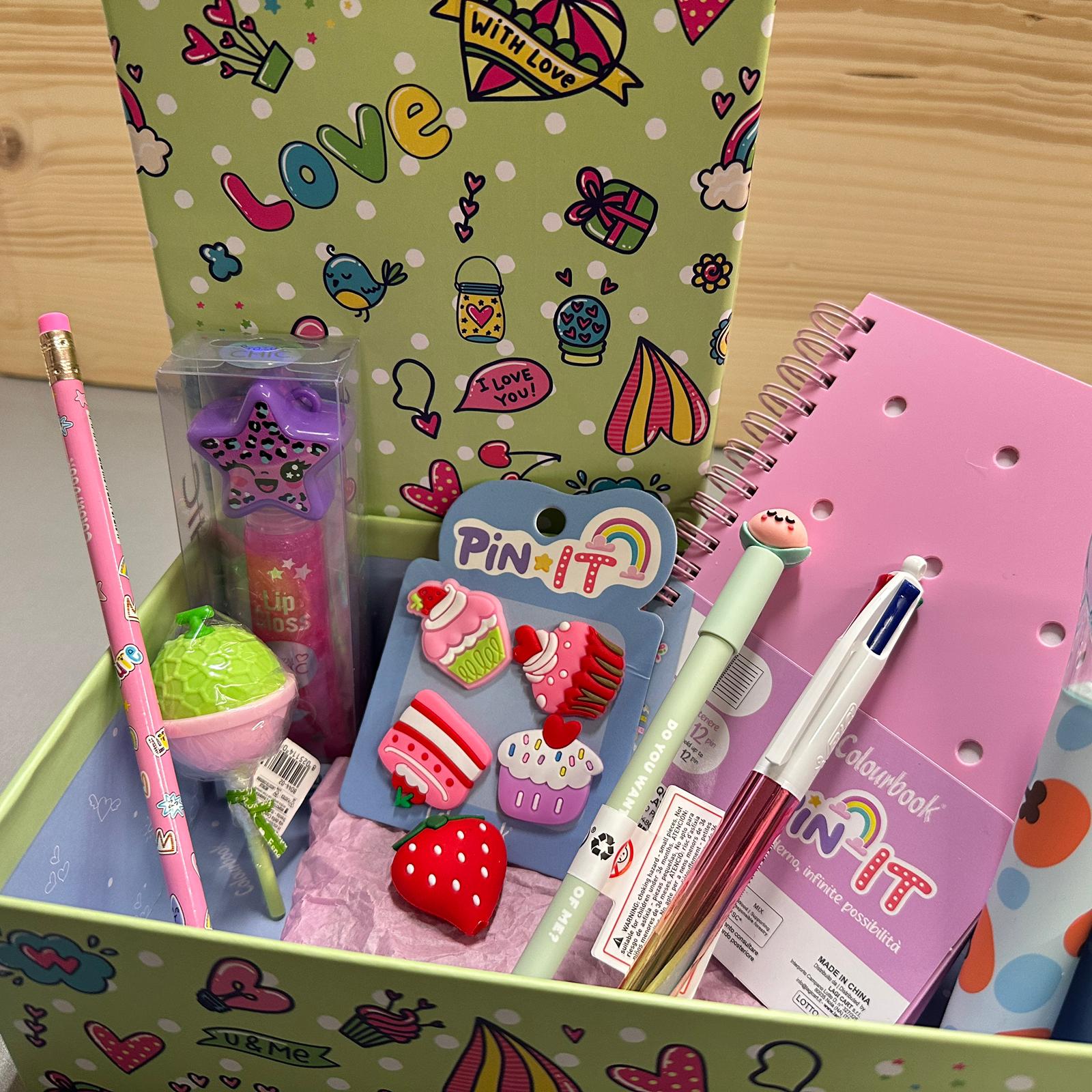Questa box tema sweet è perfetta per chi ama la cartoleria kawaii ispirata al mondo dei dolci. Tra cupcake, fragole e colori pastello, ogni accessorio rende lo studio e la scrittura più divertenti e pieni di allegria.