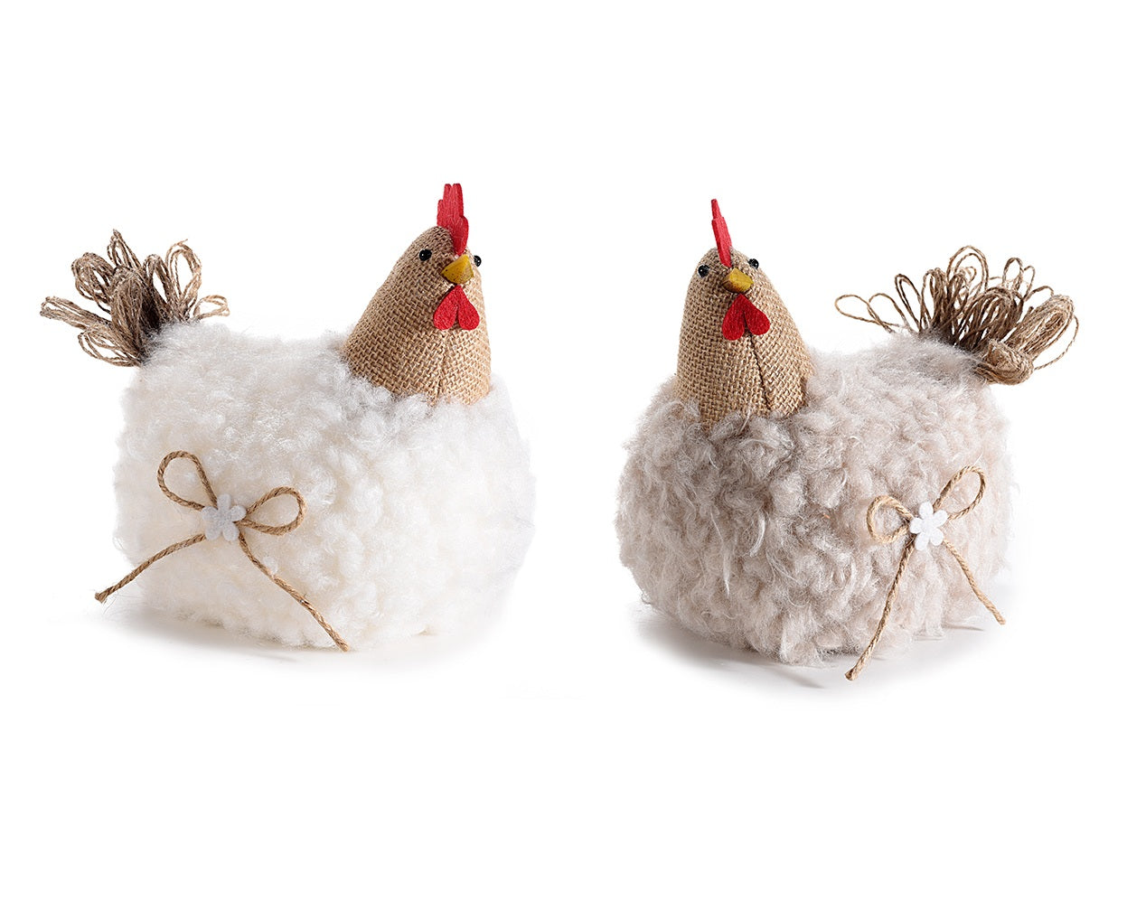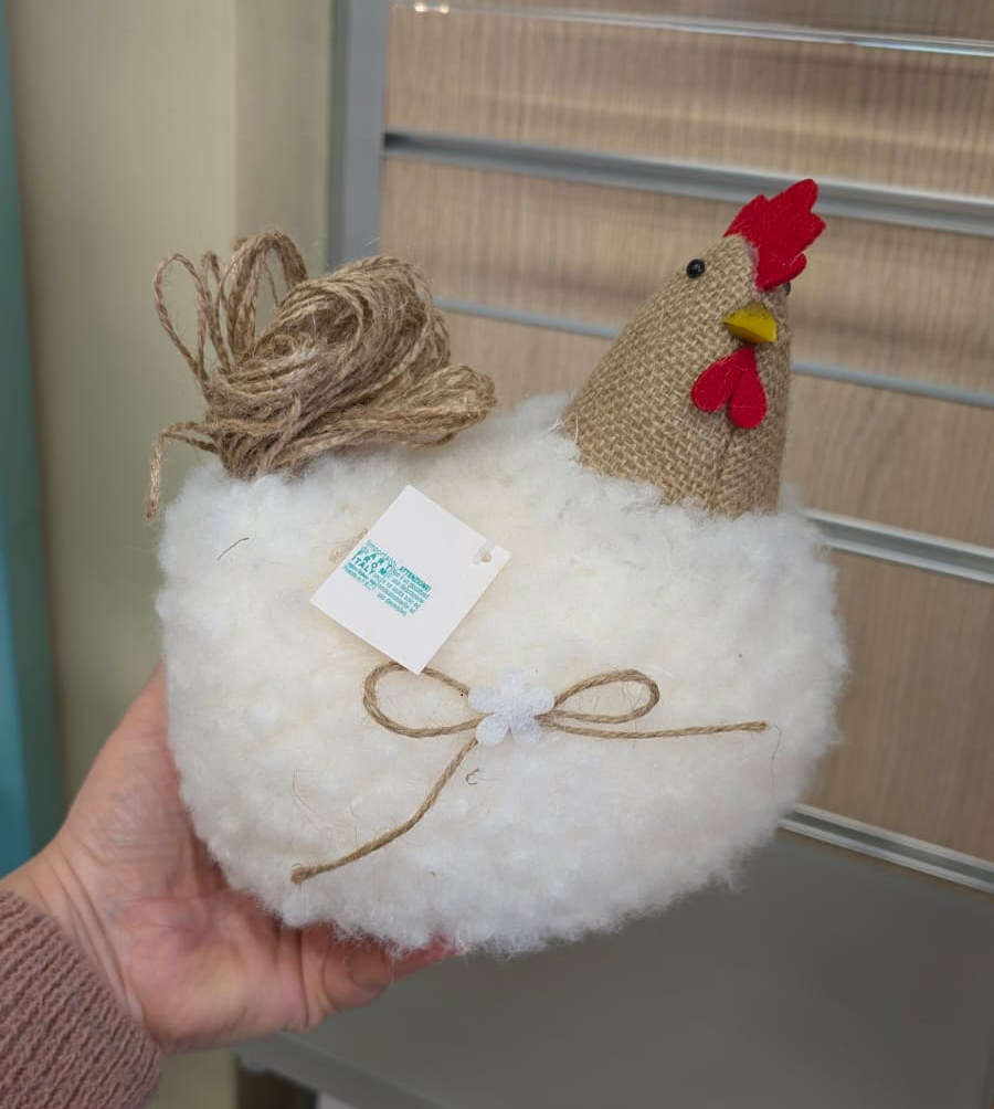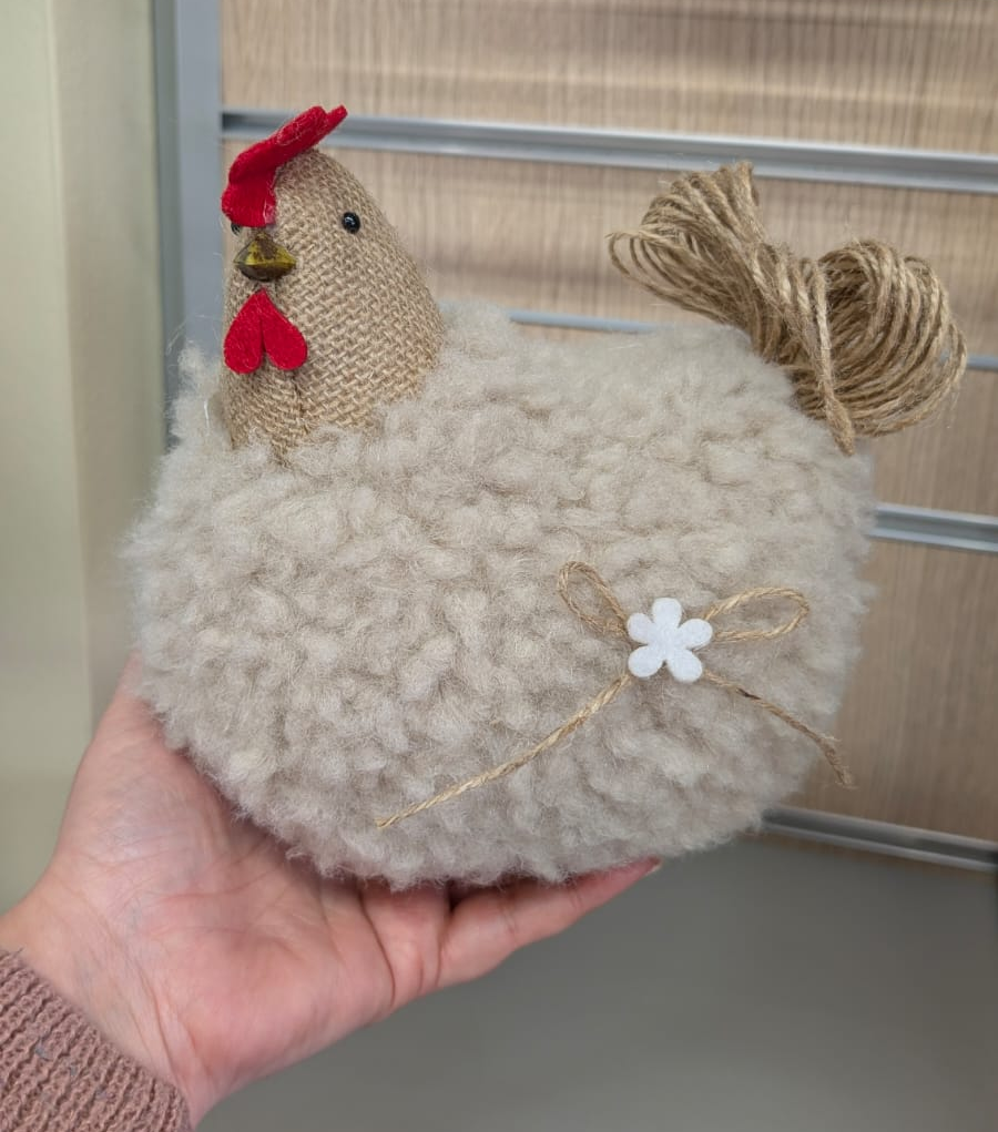 Deliziosa gallinella campagnola decorativa, realizzata in morbido pelo per donare un tocco caldo e accogliente alla tua casa durante il periodo pasquale e primaverile. Il design rustico e curato nei dettagli, con testina in tessuto effetto juta, fiocchetto decorativo e piccolo decoro floreale, la rende perfetta per arricchire qualsiasi ambiente con stile naturale.
