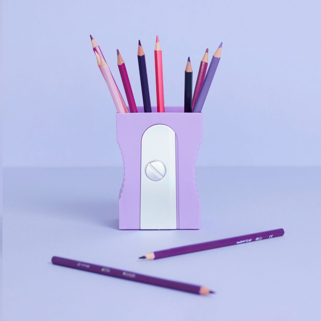 Il design richiama la forma di un grande temperamatite, con finitura moderna color viola, perfetto per studio, scuola e ufficio.