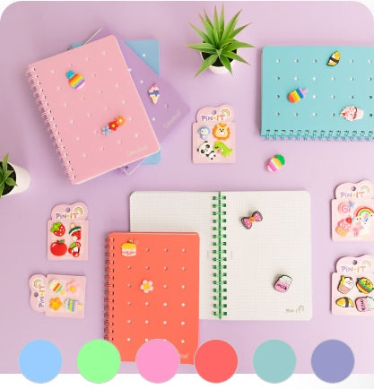 6 copertine forate in ppl dai colori pastello sono la base per aggiungere, spostare e togliere i pins che più caratterizzano il tuo stile. Fiorellini, gelati, piccoli animali sono i protagonisti del tuo quaderno unico e originale.