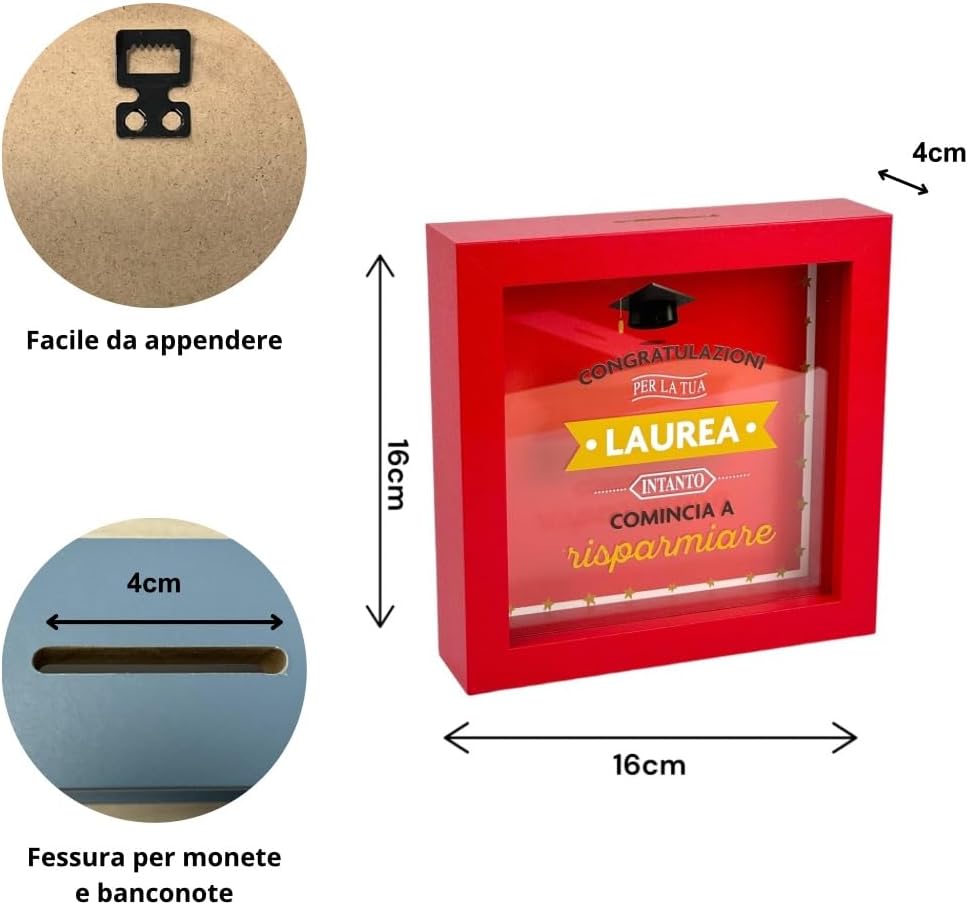 Celebra un traguardo importante con un salvadanaio dal design elegante e simbolico, perfetto per congratularsi con un neolaureato e incoraggiarlo a costruire il proprio futuro. Realizzato a forma di cornice rossa con vetro frontale, presenta la scritta motivazionale: “Congratulazioni per la tua Laurea – Intanto comincia a risparmiare”, accompagnata dal classico tocco accademico.