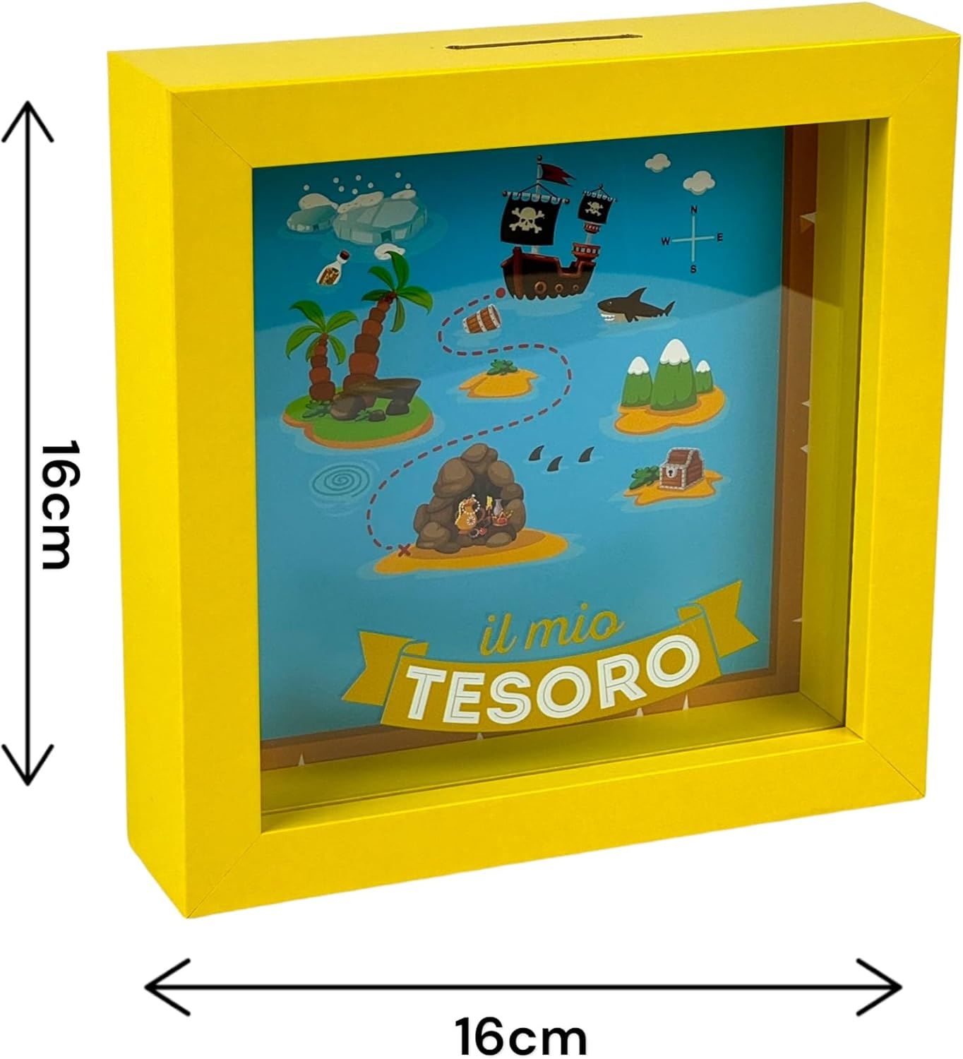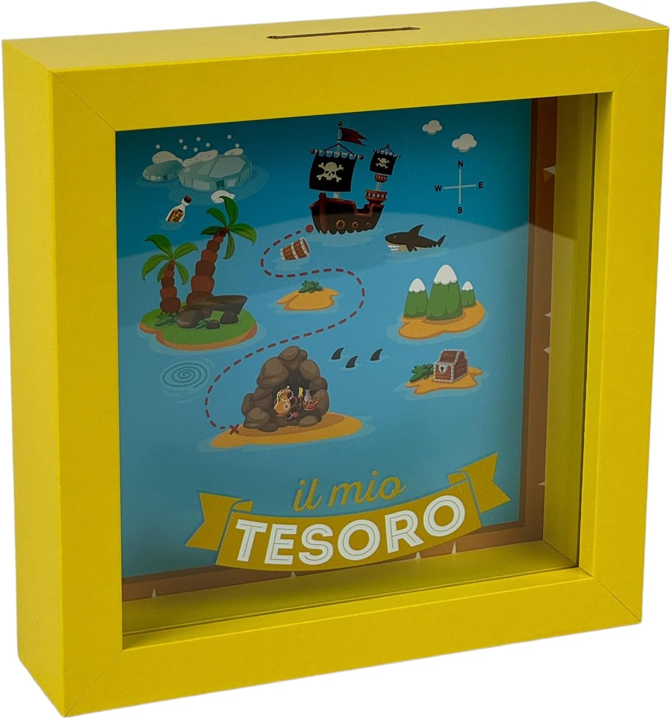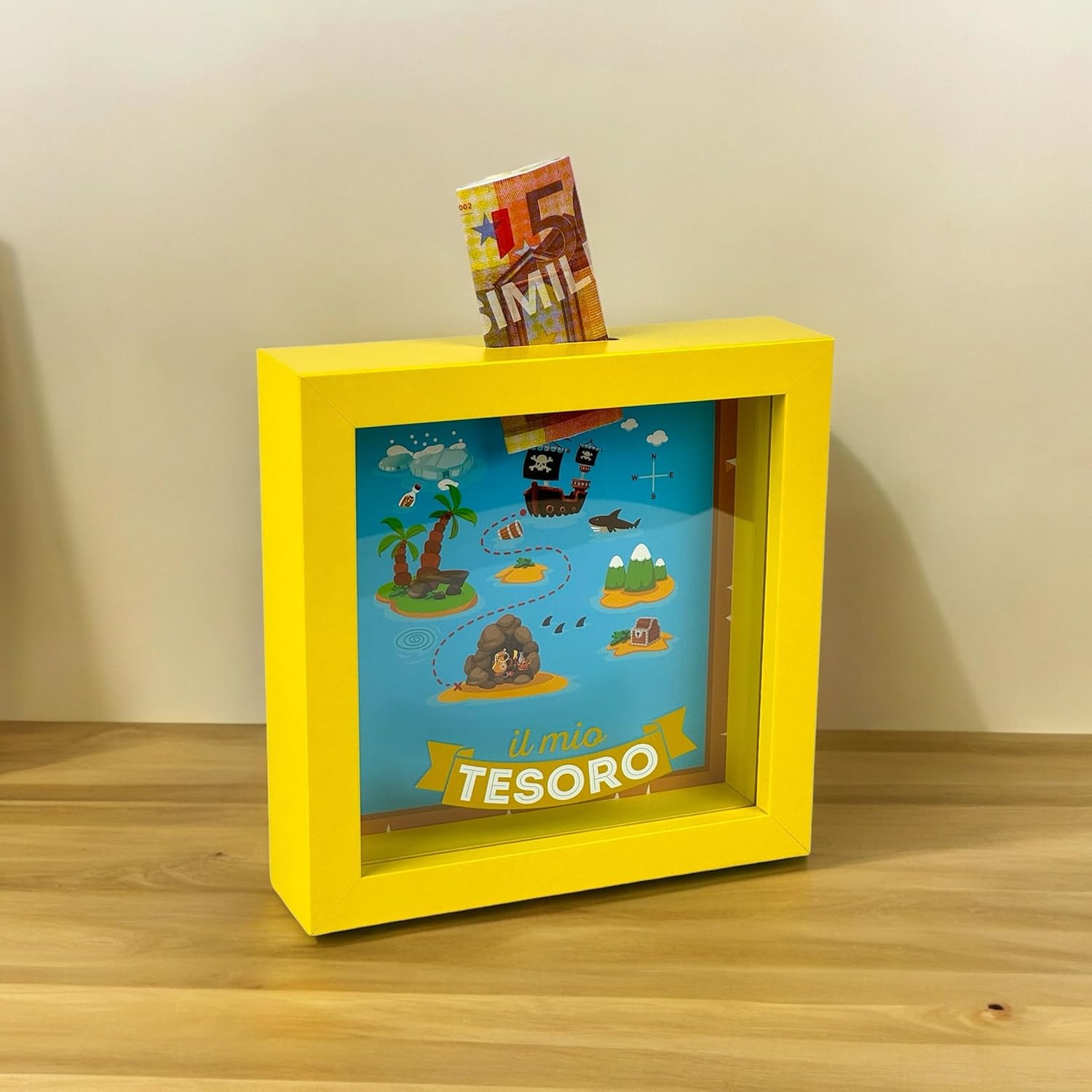 Questo salvadanaio a forma di quadretto unisce gioco e decorazione, con una simpatica mappa del tesoro che rende ogni monetina una piccola avventura. Perfetto per camerette, mensole o scrivanie.